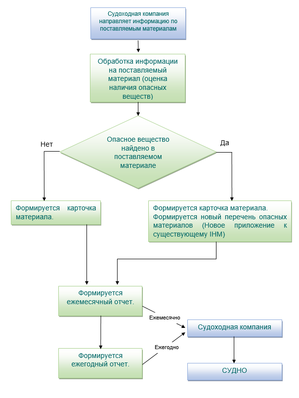 Согласно договорных отношений, судоходная компания передает IHM компании процесс выполнения оценки наличия в поставляемых на судно материалах – опасных веществ.