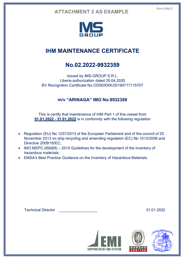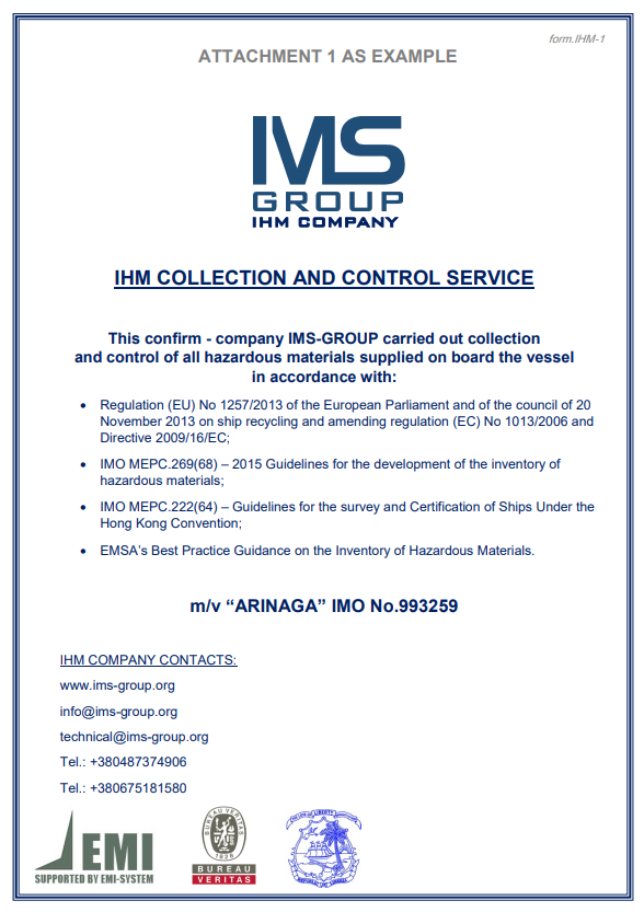 Данная форма подтверждает, что IHM компания, от имени компании судовладельца - взяла на себя обязательства по учету и контролю всех поставляемых на борт судна материалов на наличие в них опасных веществ.