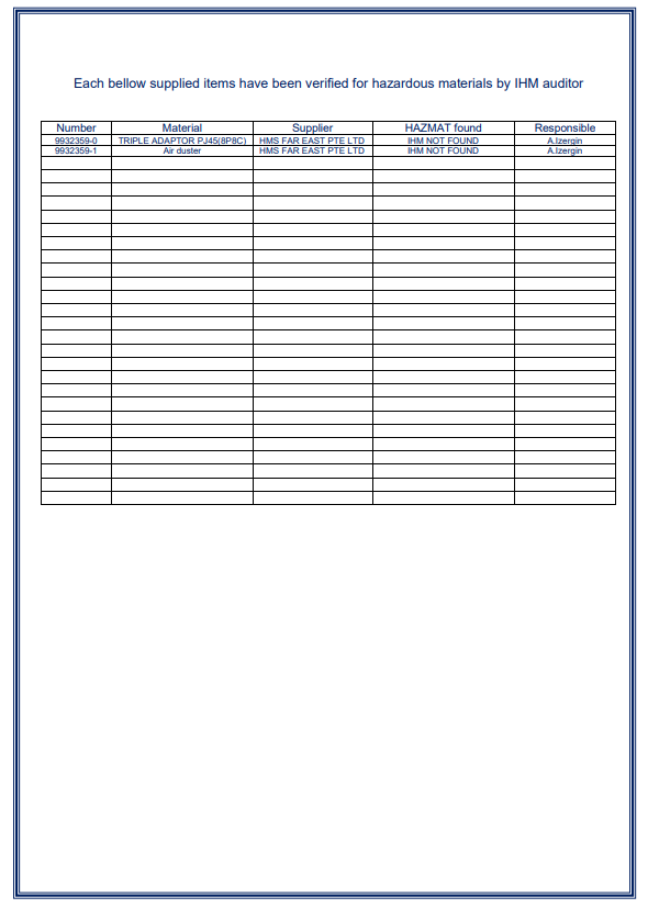 По результатам проверки каждого поставляемого на борт судна материала, IHM компания составляет карточку – о наличии или отсутствии в материале опасных веществ.